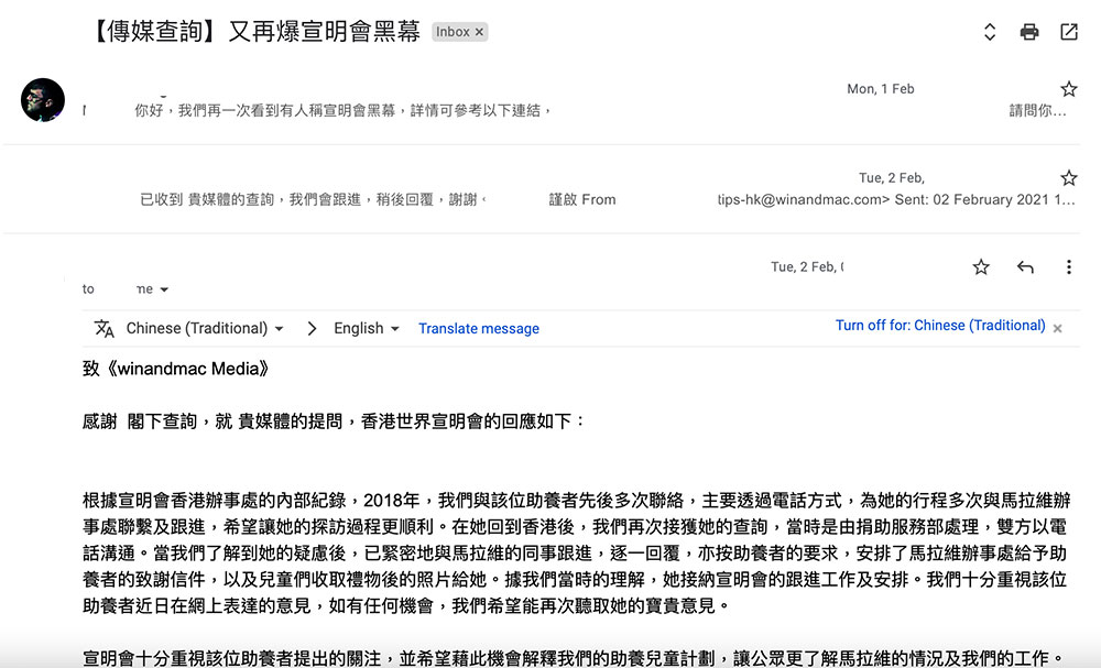 早前我們提過又再有人,提到當年宣明會助養兒童黑幕事件。宣明會回應我們winandmac Media記者查詢時,提到當時已與當事人緊密跟進,指當事人接納宣明會有關跟進工作和安排。至於提到有關助養兒童,為什麼助養者透過宣明會提供金錢上資助後,仍然一句英文都唔識。宣明會指這些助養兒童未必能用流利的英語表達自己的想法,一般會邀請助養孩子的親友或當地義工代筆。如果孩子需要他人代筆,一般會在信件中註明由他人代筆。
