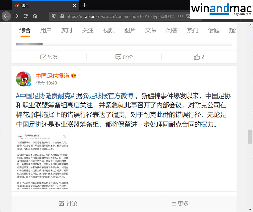 中國大陸最近因為新疆棉花一事,杯葛大量外國品牌,包括Nike、Addidas、H&M、無印良品等。不少國際品牌已經爭住跪低,例如無印良品就特別在產品名字前,加上新疆棉花,強調自己產品有用涉嫌強制勞動的新疆產品。不少與這些國際品牌有簽約的中國藝人,只要有關品牌曾在外國網站提過不用新疆棉花,都立即割席,例如藝人陳奕迅就就立即與Adidas解約。有網民叫中國足球隊都要這樣做,唯一直沒有表態割席。