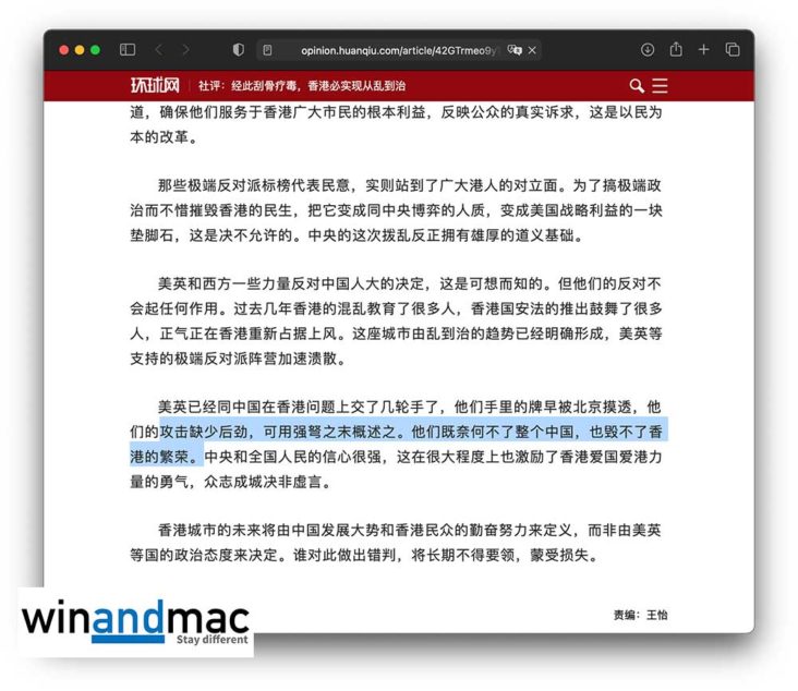 環球時報提到,中央完善香港選舉制度,旨在確保愛國者治港的原則得到貫徹落實,認為香港的統治將從此翻開新的一頁,可以對香港亂象做出的「刮骨療毒」,深得中國全社會支持。內文又強調,「像前兩年那樣亂下去,香港將沒有未來」,而內文亦不停重覆強調,「極端反對派」一字。