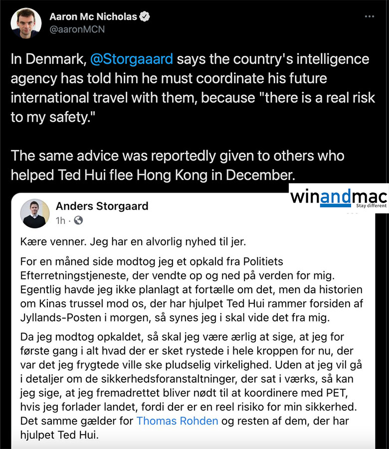 曾協助許智峯流亡的丹麥政客受威脅  出國時要與情報機關聯絡