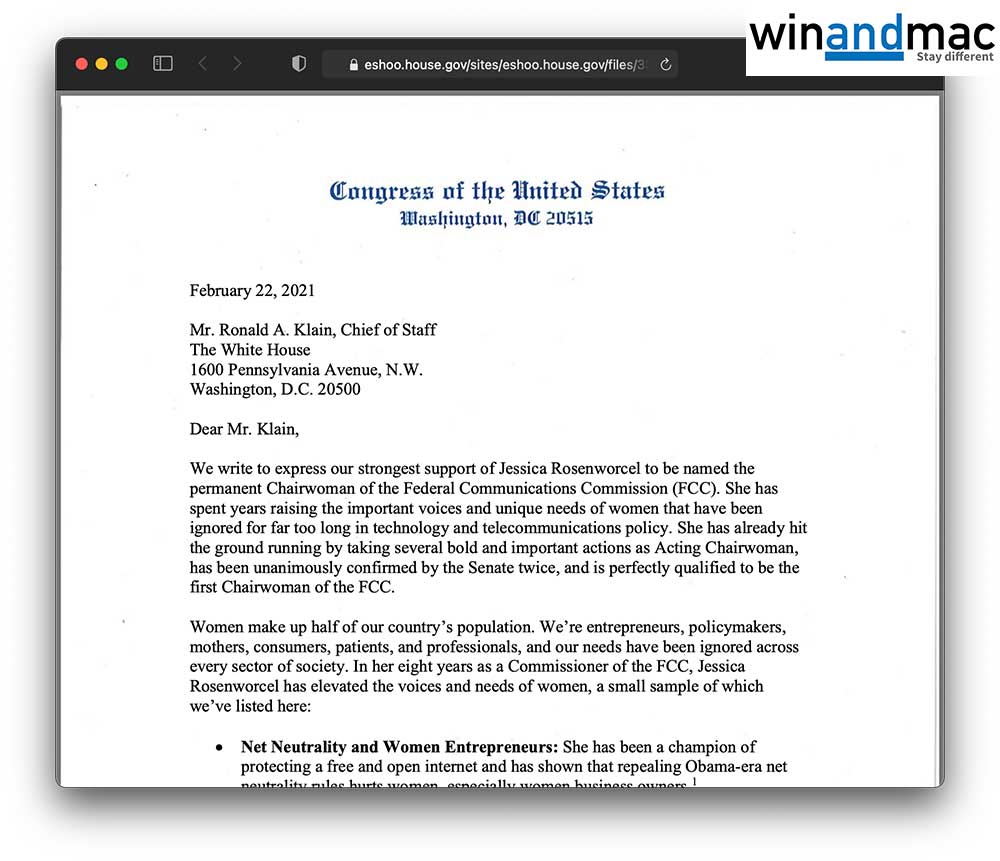 Jessica Rosenworcel原本在特朗普時期已被任命為長官,亦因為特朗普提名重返通訊業,接著於拜登政府也獲提名做署理主席。唯拜登政府一直無把其升上正式主席,引發有30名眾議院人士簽署要求拜登「更正」有關錯誤。(下圖)
