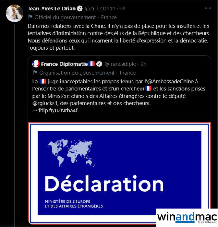 法國外交部也有發表新聞稿批評中國行為,並指法國三權分立,並指法國尊重的自由適用於個人,當中包括學術自由、個人自由、權力分立等。法國提醒中國,必需尊重法國的所有法律,並指中國有關行為無助法國與中國的關係。新聞稿更寫道,中國這種行為有人指是為了回應歐盟數小時前公佈的制裁,但法國認為,中國這樣把此事與學術自由、言論自由和最重要的基本自由綁在一起,無助中國真正解決歐盟提出的問題。