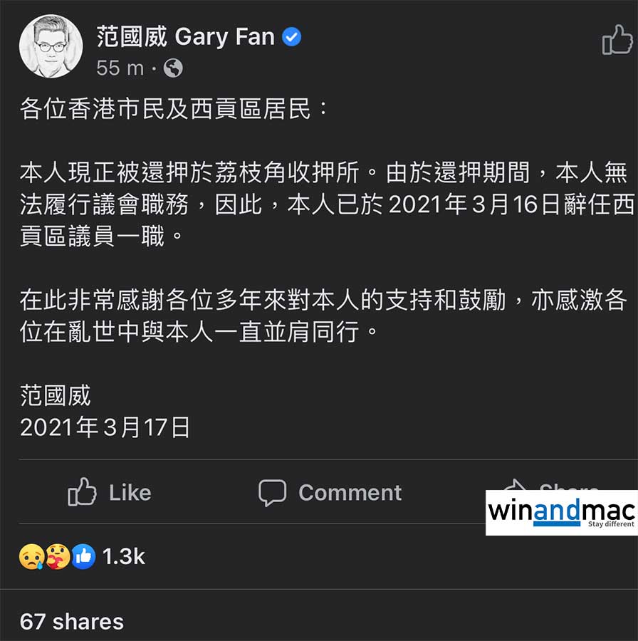 47名泛民因為參加初選被捕一事,僅得少部份人士獲保釋覆核成功,唯可惜范國威不是其中之一。本身亦是西貢區議員的范國威,於數小時前在社交網絡宣佈,指由於還押期間,他無法履行議會職務,故此已於2021年3月16日辭任西貢區議員一職。范國威表示,在此非常感謝各位多年來對他的支持和鼓勵,亦感激各位在亂世中與他一直並肩同行。
