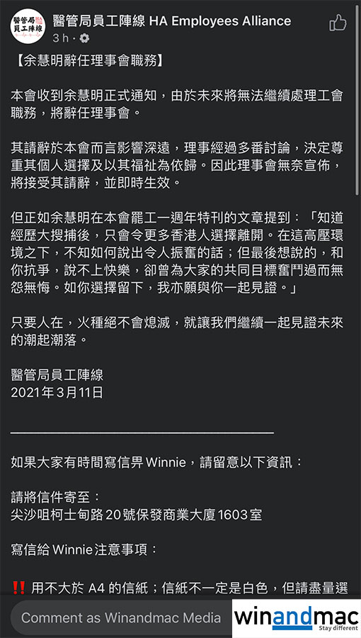 本身是醫管局員工陣線主席的余慧明,近日因為參加初選而被控涉違反國安法,目前正被扣押。余慧明於日前向醫管局員工陣線發出通知,指未來將無法繼續處理工會職務,將辭任理事會。醫管局員工陣線表示,理事經過多番討論,決定尊重其個人選擇及以其福祉為依歸。因此理事會無奈宣佈,將接受其請辭,並即時生效。他們在最後提到「只要人在,火種絕不會熄滅,就讓我們繼續一起見證未來的潮起潮落。」。