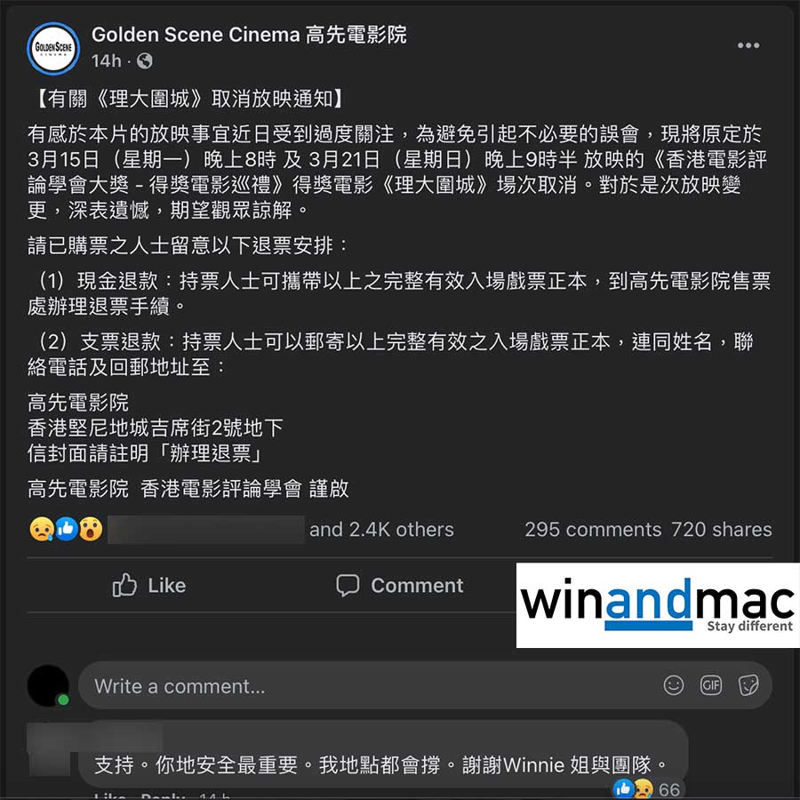 《香港電影評論學會大獎 – 得獎電影巡禮》得獎電影《理大圍城》原本獲安排在高先電影院放映,不少人排隊購票,可惜的是,一早已經引起不少黨媒關注,文匯報指其或違法,又說這種行為是散播仇視國家情緒。很多親中的網上言論,亦不斷批評有關電影和放映行動,指要報國安等等。結果,高先電影院決定取消放映《理大圍城》,稱有感於本片的放映事宜近日受到過度關注,為避免引起不必要的誤會,故此決定取消放映。