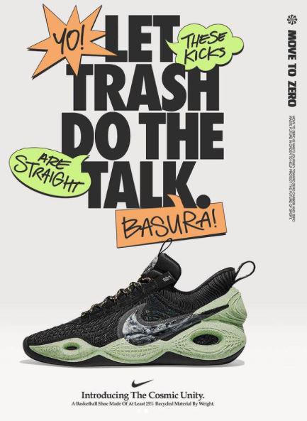其實,翻查資料,Let trash do the talk是Nike於二月尾在全球推出的新廣告(見下圖),主要是推銷他們可持續發展的環保籃球鞋,當中有最少25%是使用循環再用物料,所以廣告中就用上trash一字。京東網看見愛國人士這麼憤怒,當然也極速跪低把產品廣告移除。