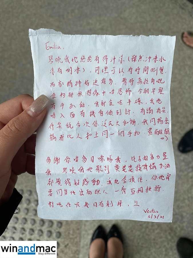 47人因為參加初選而被控串謀顛覆國家政權,連續第三日馬拉松式保釋聆訊。被告之一劉頴匡的女友收到紙仔,劉穎匡向女朋友提到,昨晚終於有機會沖涼,而且亦有時間睡覺,精神好了很多。劉穎匡亦感謝女友這麼多天旁聽,又說聽到黃婆婆接車講加油很感動,並指自己會頂住。劉穎匡稱在扣押時有機會與其他人聊天,又指自己與楊岳橋扣上同一個手扣,「畫面好靚」,大家「有講有笑」,「仲笑說今次係泛民大和解」。