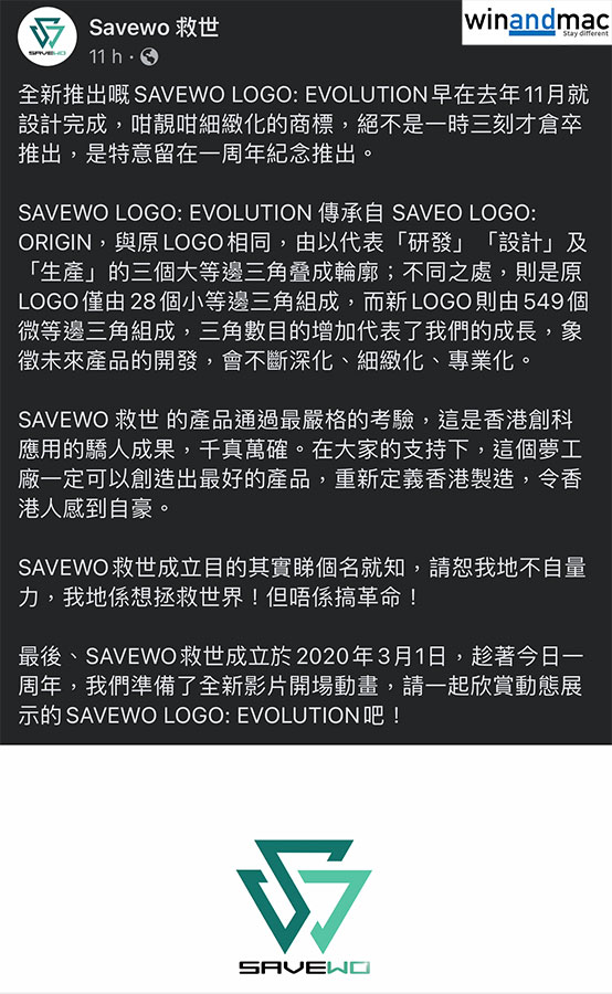 SAVEWO LOGO: EVOLUTION商標明顯不像5.1,因為淺綠色一邊已經變成多邊形,而不再像1字。SAVEWO救世口罩在文章末段強調,「唔係搞革命!」,並指他們真的是在2020年3月1日成立。SAVEWO救世口罩在留言中表示,採用原有logo的Original版本仍會發售,亦即採用兩種不同logo的救世口罩將會在市場上看到。