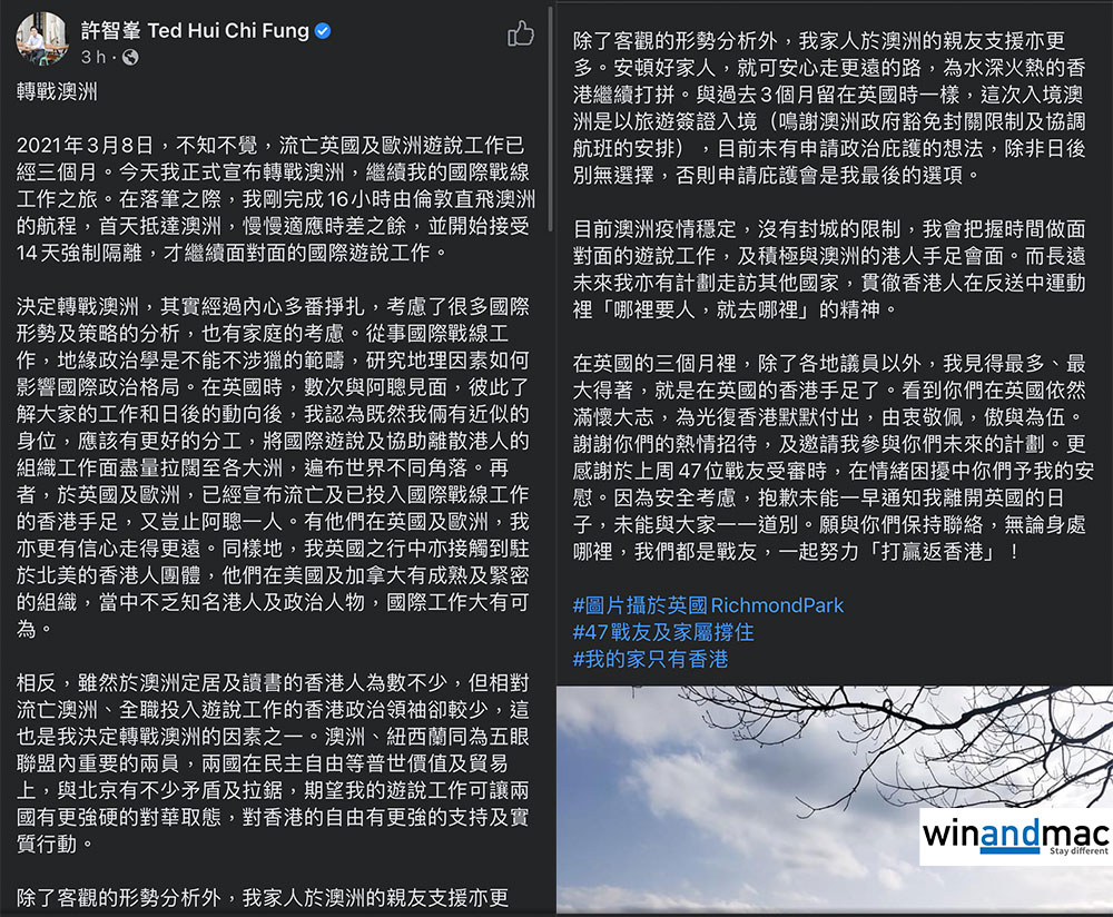 早前宣佈流亡的許智峯,由丹麥轉到去英國後,與英國當地不同的手足會面。他於數小時前宣佈,正式宣佈離開英國,轉戰澳洲繼續國際戰線。他目前已經到達澳洲,開始接受14天強制隔離,其後就會繼續國際遊說的工作。許智峯提到,在英國時多次與羅冠聰會面,認為自己與羅冠聰有近似的身位,故此應有更好的分工,把國際遊說與協助離散港人的工作,盡量拉闊,遍布世界不同角落。