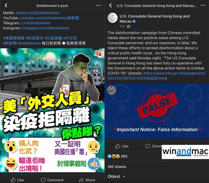 日前黨媒已經聲稱收到消息,指美國駐港領事館有人中武漢肺炎,但又有特權兼拒絕與港府合作。大公文匯旗下的《點新聞》今天仍然不收手,狂罵「美外交人員染疫拒隔離」。被人罵了多於一天後,美國駐港領事館終於有反應,不點名指有關消息是假資訊。