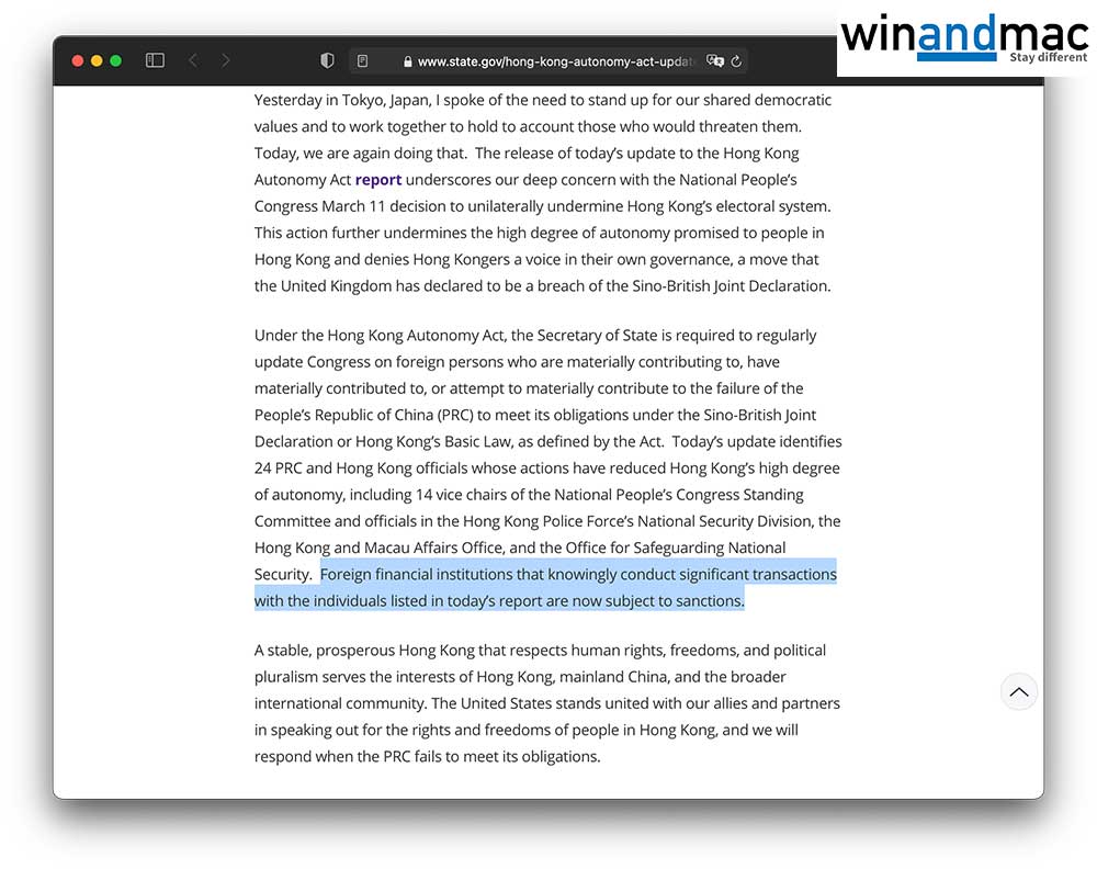雖然24名單中的人並無新人,但美國國務院今日發表了最少兩份新聞稿,針對中共政府近日「完善」香港選舉制度的問題,稱中共這樣做將破壞讓香港人高度自治的承諾,亦破壞中英聯合聲明。國務院其中一份新聞稿揭示,今日這24名「入選」名單的人,制裁將會加辣。任何外國金融機構若與這些被制裁人士有任何重大交易,亦將會受到制裁。