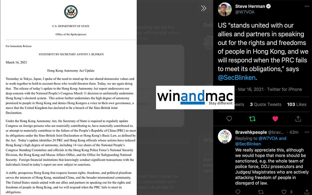 美國強調會繼續與香港人同行,與盟友為香港人的權利和自由發聲,並會回應中共違反承諾而採取行動。