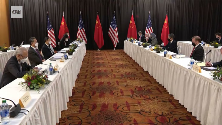 中國與美國高層於當地時間18號,正式在阿拉斯加會面,當地傳媒可拍攝開場部份的一小時。美國代表國務卿Antony Blinken在首場表現極為軟弱,批評中方對香港和台灣打壓的事情,威脅世界穩定的秩序。中國在會上則態度強硬,中方代表楊潔篪聽完後,立即在會上展開長達10分鐘反擊,指美國人權狀況差劣,不少人對美國所謂的民主失信心。他亦續指,近日加強制裁24名中港官員,批評美國只是想干預中國內政,又指美國軟弱無法逼中國就犯。