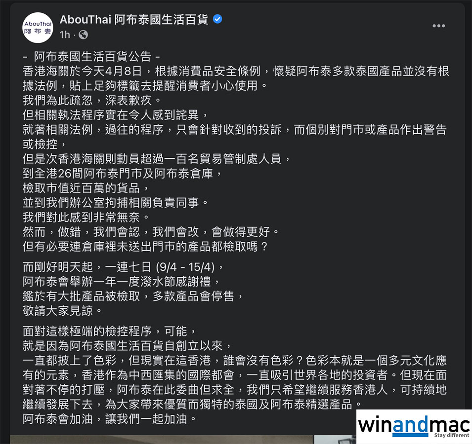 阿布泰國生活百貨表示為此疏忽,深表歉疚,但質疑相關執法程序,並指「有必要連倉庫裡未送出門市的產品都檢取嗎」。阿布泰國生活百貨指剛好明天起,一連七日(9/4 – 15/4)為阿布泰一年一度潑水節感謝禮,由於有大批產品被檢取,多款產品會停售,望顧客體諒,他們最後寫道「阿布泰會加油,讓我們一起加油。」。