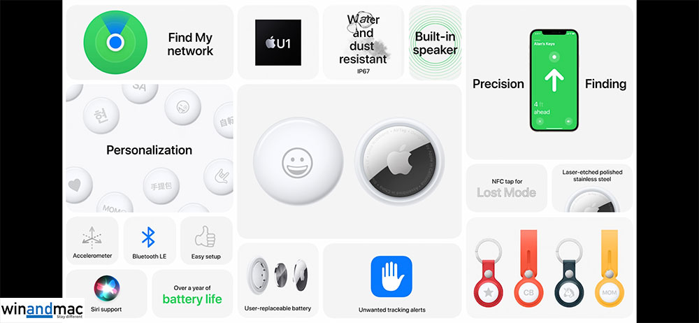 傳言傳了很久,講又講了很久的蘋果AirTag,終於在今天的發佈會中正式登場。AirTag體積不算大,可以當作鎖匙扣,又或者扣在不同的東西如行李或手袋上。扣好後,假設你忘記了扣上了AirTag的鎖匙放在那裏,就可以用iPhone去搜尋。若使用iPhone 12,更有Precision Finding以更準確方式找到AirTag。