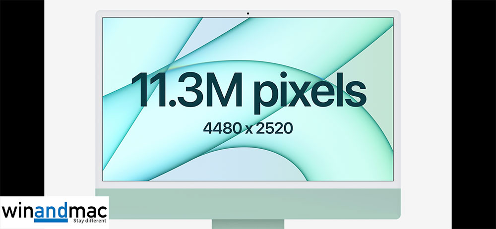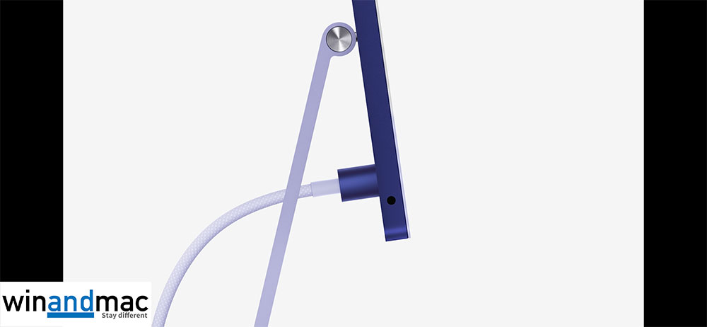 iMac機身變薄後,螢幕卻變得更大為24″,解像度達4480 x 2520。據稱機頂的鏡頭都有改善,而咪高峰也有改變,可以讓用家更清晰地去做視像會議或與朋友聊天。而喇叭亦有提升,睇戲或打機時感覺更好。iMac背後有四個USB-C接駁口,其中兩個支援Thunderbolt,而原本的網絡接駁口則搬到充電器上,蘋果稱這樣可以更整齊。