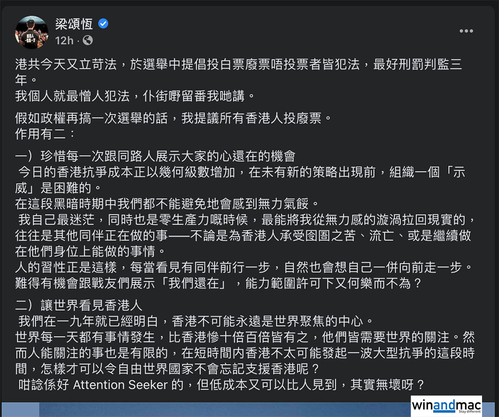 目前已流亡美國的梁頌恒在社交網絡表示,指「我個人就最憎人犯法,仆街嘢留番我哋講。」,他直言假如政權再搞一次選舉的話,他個人提議所有香港人投廢票。