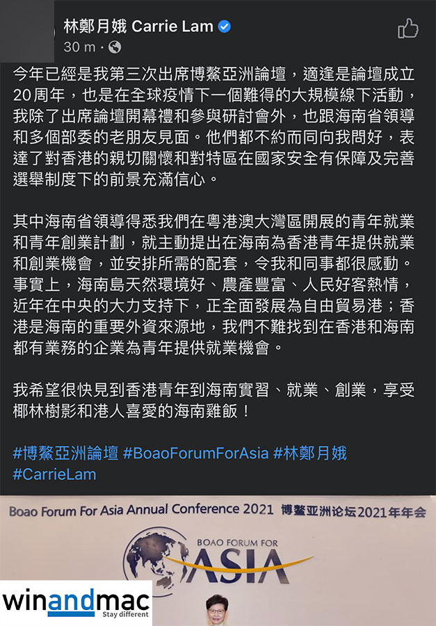 博鰲亞洲論壇目前正在舉行,不少中國官員都有出席,包括香港特首林鄭月娥。林鄭月娥出席後在社交網絡發表文章,表示除了出席論壇開幕禮和參與研討會外,也跟海南省領導和多個部委的老朋友見面。他們都不約而同向她問好,表達了對香港的親切關懷,對特區在國家安全有保障及完善選舉制度下的前景充滿信心。