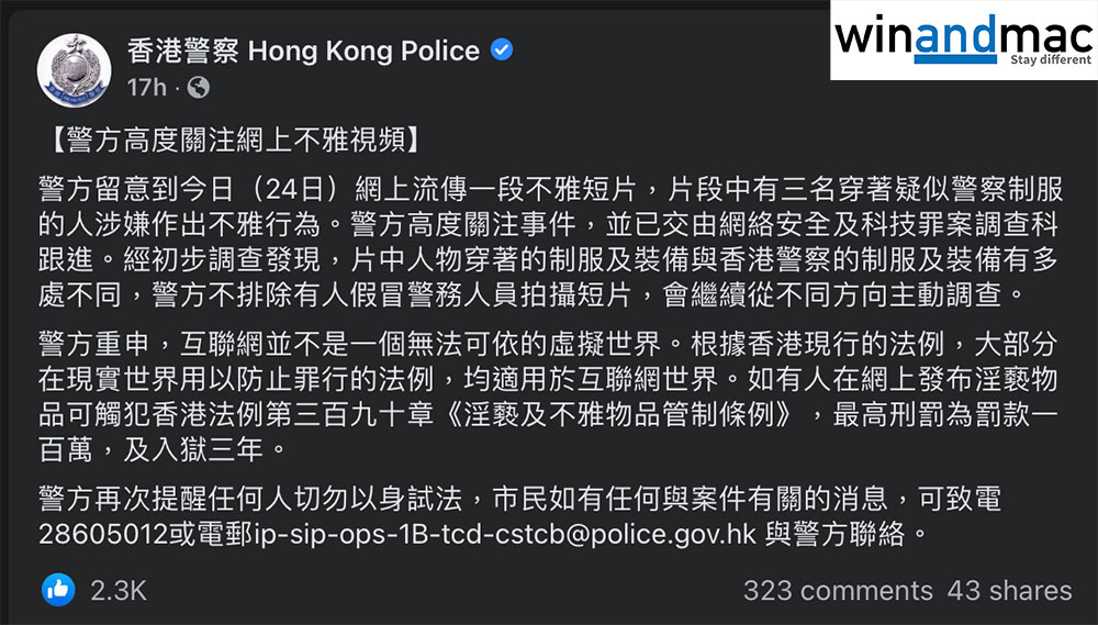 日前網絡上群組和討論區,突然瘋傳三名穿著香港警察制服的男子,正在進行性行為的片段。香港警方留意到有關事件,並在社交網絡表示,高度關注網上不雅視頻。香港警方稱,有關案件已交由網絡安全及科技罪案調查科跟進。雖然有網民指三名男子的警察裝備齊全,可能是真警察。但香港警方強調,經初步調查發現片中人物穿著的制服及裝備,與香港警察的制服及裝備有多處不同,警方不排除有人假冒警務人員拍攝短片,會繼續從不同方向主動調查。