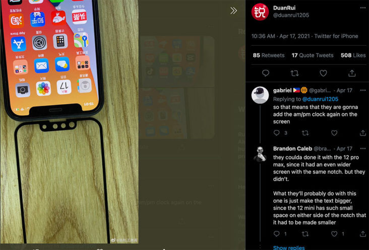 不知是不是因為iPhone的大變化愈來愈少,近來談及iPhone 13的傳言時,不少人都集中在前置螢幕的M字額。早前已有消息指,iPhone 13的M字額會明顯變少。一直頗準確地流出不少蘋果消息的Twitter用戶DuanRui,在社交網絡上發表新相片,當中可以看到疑似iPhone 13的前置保護貼,並與iPhone 12作出比較。當中可以看到iPhone 13黑色的部份佔的比例較少,對於用戶來說應該是好事。