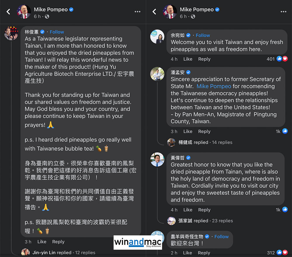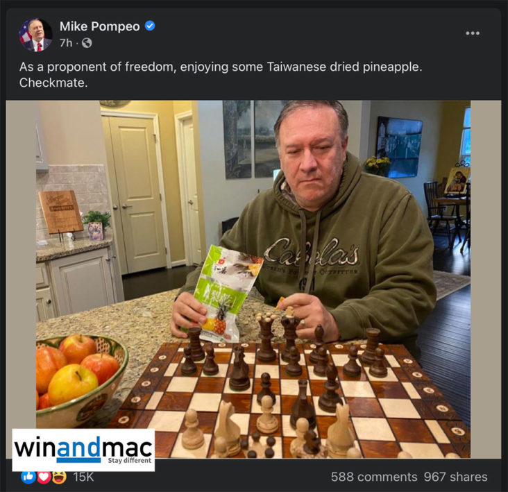前美國國務卿Mike Pompeo卸任後,仍然十分關心時事。在任期間打開了台灣與美國交流正常化的他,數小時前在社交網絡發佈相片,寫道「身為自由擁護者,正在享受台灣的鳳梨乾。將軍無棋」,而他似乎正在與別人玩國際象棋。不少台灣政治人物都立即在有關相片下留言,感謝Mike Pompeo的支持,包括臺南市立委林俊憲、桃園市政府資訊科技局局長余宛如、屏東縣縣長潘孟安等。