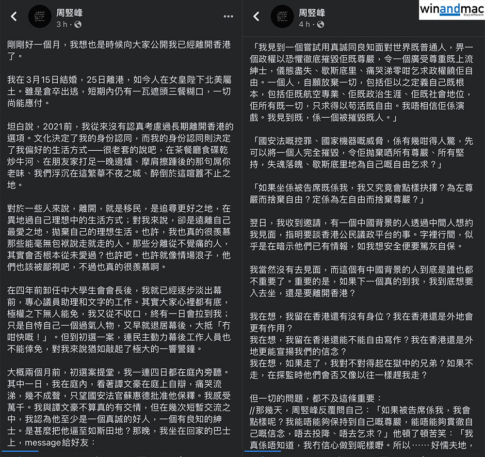 前中大學生會會長周竪峰於社交網絡宣佈,他已經離開香港,雖沒有清楚寫明去了那裏,但就寫道「人在女皇陛下北美屬土」,相信大家都應該估到。他承認是倉卒離開,他於3月15日結婚,25日就離港。周竪峰稱2021前並無想過離開,他習慣了香港生活,如今離開是「遠離自己最愛之地,拋棄自己的理想生活。」。