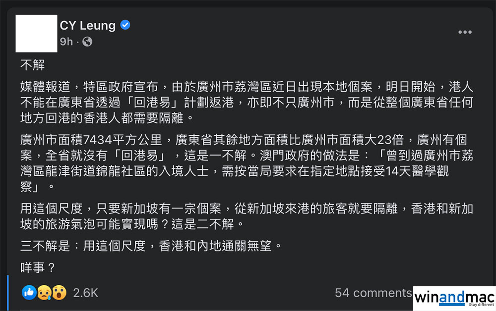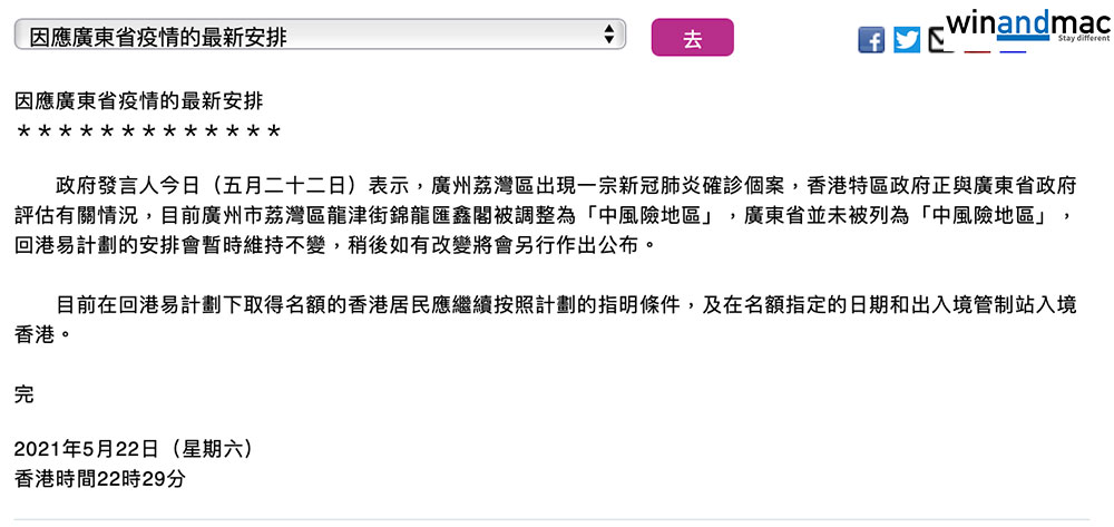港府晚上最新公佈稱,廣州荔灣區出現一宗新冠肺炎確診個案,香港特區政府正與廣東省政府評估有關情況,目前廣州市荔灣區龍津街錦龍匯鑫閣被調整為「中風險地區」,其他廣東省地區並未被列為「中風險地區」。回港易計劃的安排會暫時維持不變,稍後如有改變將會另行作出公布。這表示在大陸的香港居民,將繼續自由回港,而且不需強制檢疫。梁振英其後亦串爆寫「歡迎特區政府從善如流。」。