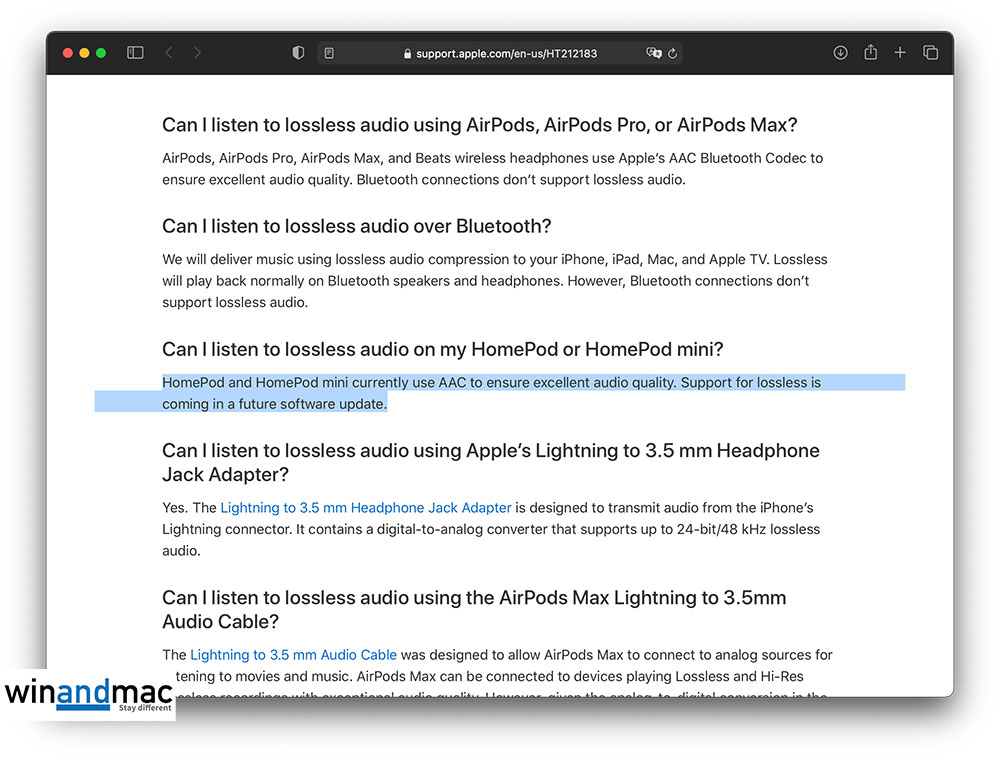 有興趣可按此查閱有關文件,當中提到有關HomePod或HomePod mini能否收聽無損音樂一條問題的答案(下圖),當中提到目前HomePod或HomePod mini使用AAC格式提供不錯的音樂質素,日後會有軟件更新支援無損音樂。有關支援文件亦有提到蘋果不同裝置,可以那一種方式去收聽無損音樂。