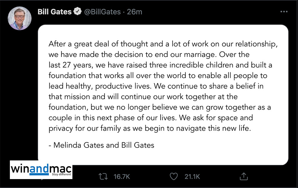 創辦微軟的Bill Gates剛於社交網絡宣佈,與Melina Gates結束27年婚姻。Bill Gates將繼續與Melina Gates一起工作,為他們一同創立的慈善機構而努力。不過,他們覺得無法一起在下一個人生階段一起成長,故此決定分開。他們希望公眾能尊重他們的私隱,以及給予他們空間。