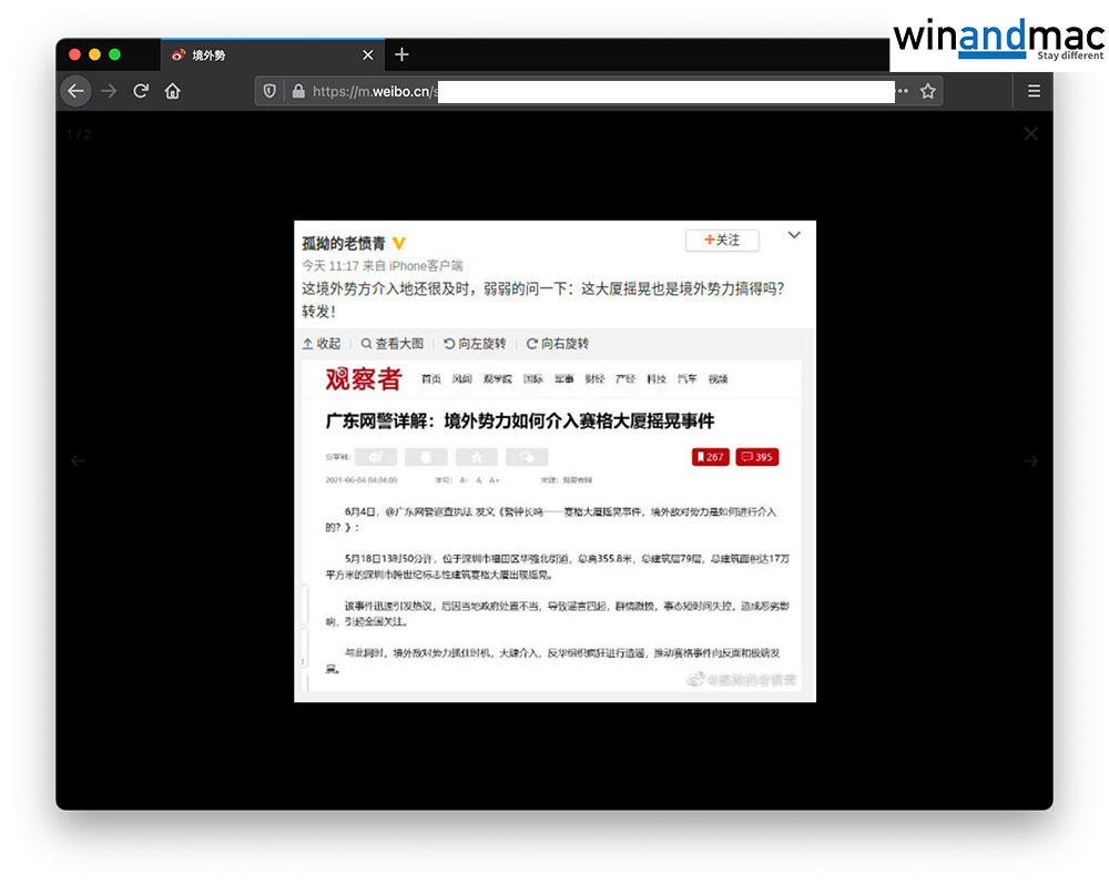 有關文章提到,在賽格大廈發生搖晃期間,「境外敵對勢力抓住時機,大肆介入」,又把事件定性為「反華」、「瘋狂進行造謠」。有網民忍不住問為什麼大廈搖晃會與「境外勢力」有關,但很快就被刪除有關留言。