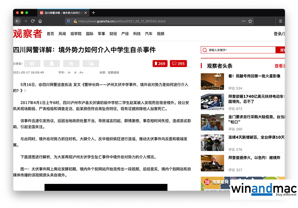 我們記者翻查過有關資料,發覺觀察者網其實經常喜愛用「境外勢力」為論點的批評文章,例如「四川網警詳解:境外勢力如何介入中學生自殺事件」、「比利時前駐港總領事:香港之前的混亂,背後肯定有境外勢力插手」等。至於為什麼突然強調,他們沒有寫過賽格大廈搖晃事件與境外勢力有關並指造謠,暫時未清楚原因。