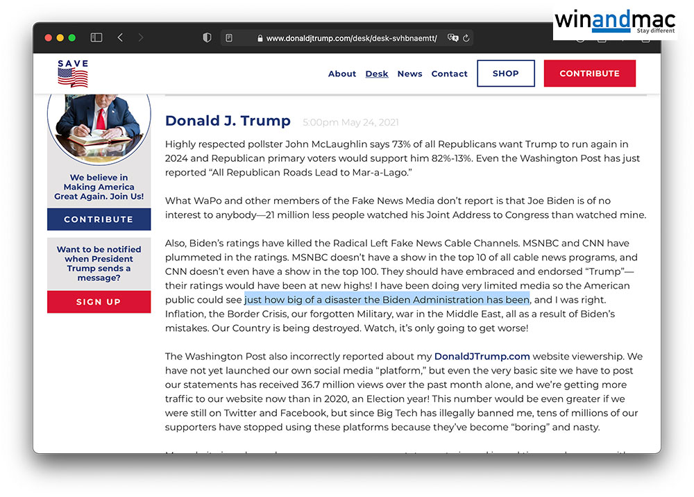 特朗普當然不少得串現屆政府,首先指拜登較早前的國會聯席會議演說無人睇,比起特朗普當時少2100萬人收看。他續指,拜登的評價令偏激左媒包括CNN與MSNBC收視大跌,MSNBC頭10位新聞節目無份,CNN更差到連頭100的節目都無。特朗普更稱,自己刻意減少在媒體前出現,是為了讓美國公眾,看清楚拜登政府災難究竟有幾大。他更預言,美國目前正被破壞,而且情況會愈來愈差。