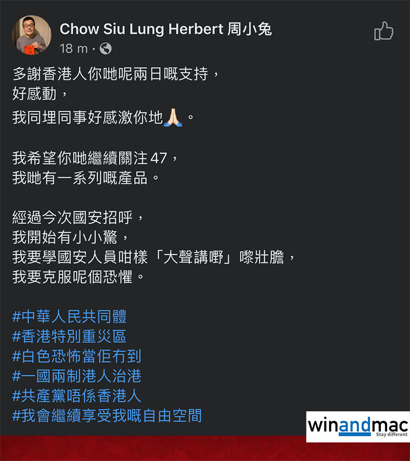 周小龍感謝香港人兩天的支持  承認有少少驚國安