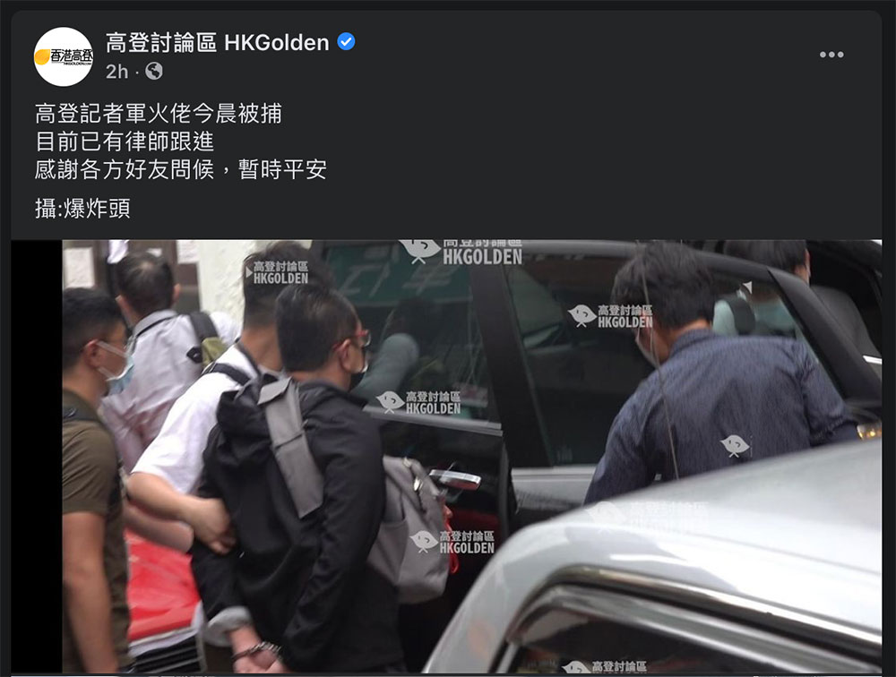 今早香港高登討論區今日突然有一分鐘直播,標題為「早POpO上門」,根據被捕人士關注組消息,懷疑高登記者軍火佬被捕,暫未知原因如何。直播僅做了一分鐘後,上門警員要求停止直播,而有關影片亦已從高登討論區專頁移除。
