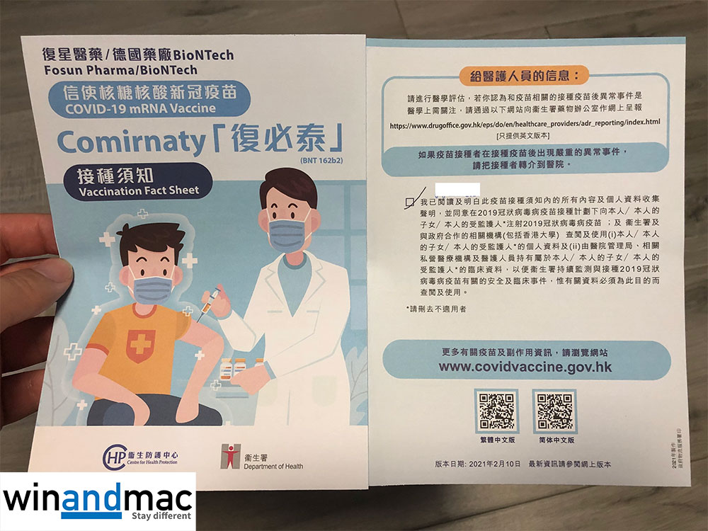 各位winandmac讀者好,我是站長的朋友,早前站長知道我會打BioNTech復必泰疫苗,想我分享一下有關打疫苗的經過,點解會打疫苗、打完有乜感覺、會唔會好大的不適反應之類,接下來會簡單講講我同其他幾個差唔多時間打針的朋友的經歷。