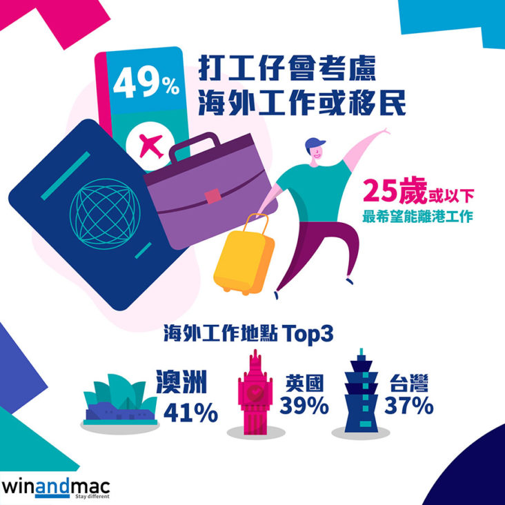 在報告中,25歲或以下的受訪者較其他年齡組別傾向考慮到海外工作或移民,比率達54%。至於46-50歲及50歲或以上的分別中,也有41%及43%表示會考慮到海外工作或移民。至於有興趣想去海外工作的受訪者中,最受歡迎的頭三個國家,包括澳洲佔41%、英國佔39%、台灣也佔37%。當中30歲或以下受訪者多選擇希望到英國工作。