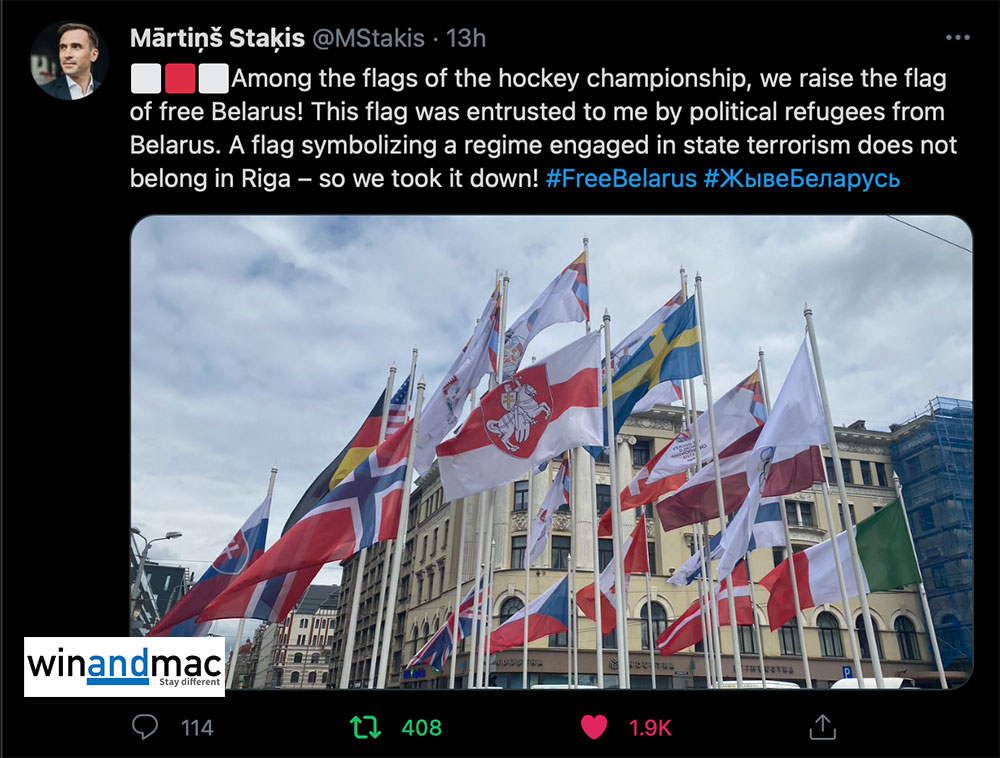 白羅斯以國家式方法劫機成功拘捕異見記者後除歐盟外,附近的歐洲國家有更強烈的行動。例如拉脫維亞Latvia的首都Riga市長Mārtiņš Staķis,為抗議白羅斯政府這種行動,叫記者採訪,然後自己親手把一間酒店外的白羅斯國旗拆走,換成反對白羅斯政府的示威紅白旗。該酒店並不是一般酒店,而是正接待著一班到拉脫維亞首都Riga,參加2021年冰上曲棍球世錦賽的白羅斯球員。Mārtiņš更串爆表示,代表著國家恐怖主義的政權的旗幟不應在拉脫維亞掛起,應該要把其移除。