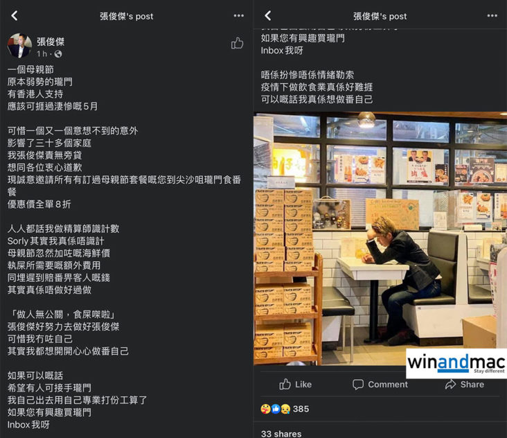 張俊傑抱怨指自己雖然是精算師,但突然被加價的海鮮,以及出事的額外價錢,再加上遲到的賠償,覺得唔做好過做。他續指,希望開開心心做番自己。他更稱「如果可以嘅話,希望有人可接手瓏門」,自己希望出去打份工就算,並著有興趣買瓏門人士,可以inbox給他去。他強調,並非扮慘和情緒勒索,只係「疫情下做飲食業真係好難捱」。