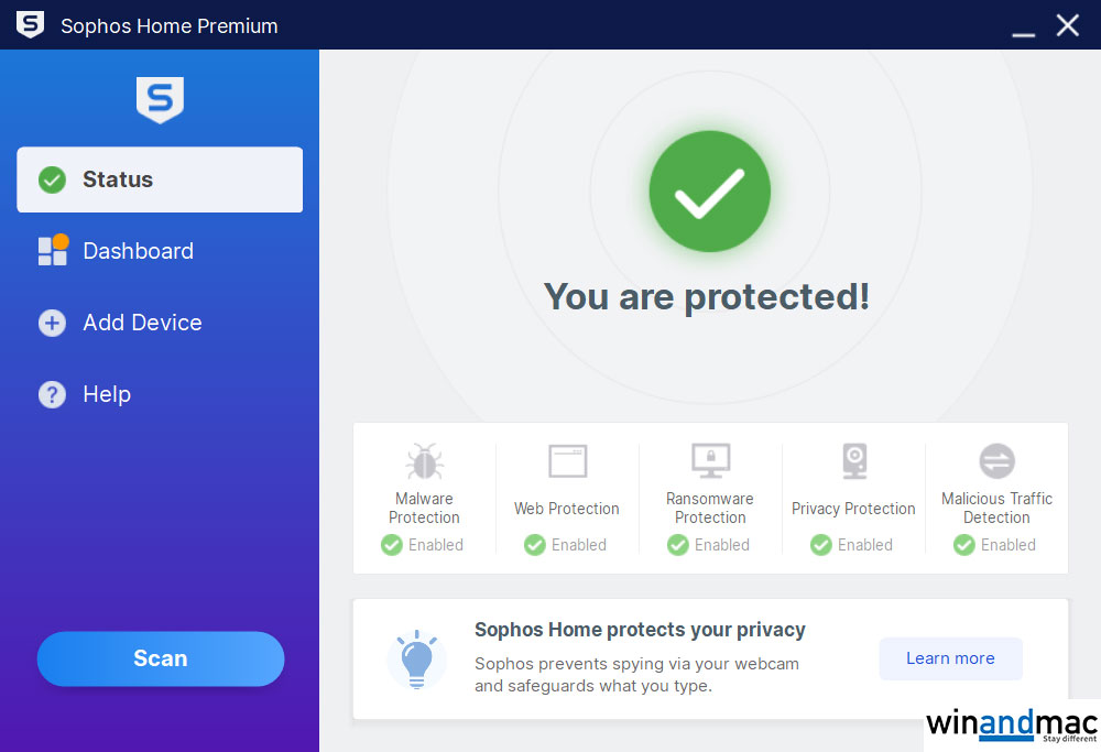 Sophos Home Premium有不同平台的版本,包括Windows、Mac甚至乎流動裝置。今次測試主要是試用Windows版,用家需在安裝時按指示註冊或登入Sophos帳戶。安裝後可看到其主要介面很簡單,會顯示目前保護狀態,包括惡意程式保護、網上瀏覽保護、防止綁架程式等,它本身亦已有實時防毒功能。介面左方會有一個Scan按鈕,一按即可快速掃描系統檔案是否存在威脅或病毒等。