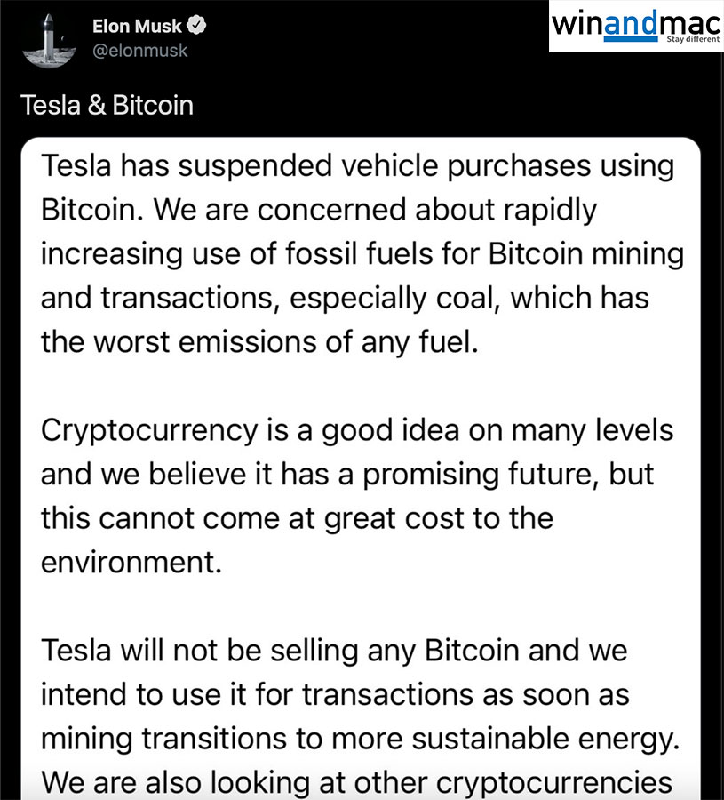 Elon Musk在Twitter上表示,Tesla關注到Bitcoin掘礦和交易時所使用化石燃料,特別是煤炭,是能源中排放最差的燃料。Tesla強調,他們仍然認為加密貨幣是未來,在多個層面上仍然是好的概念,但不能如此破壞環境。Tesla再強調他們不會賣走Bitcoin,並指若掘礦可以用更持久對環境好的能源的話,就會再用作交易。