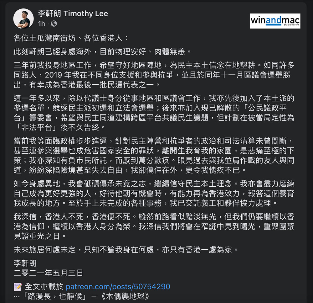 李軒朗稱會砥礪傳承未竟之志,繼續信守民主本土理念。但他拒絕透露身在何處,只表示未來旅居何處未定,「只知不論我身在何處,亦只有香港一處為家。」。
