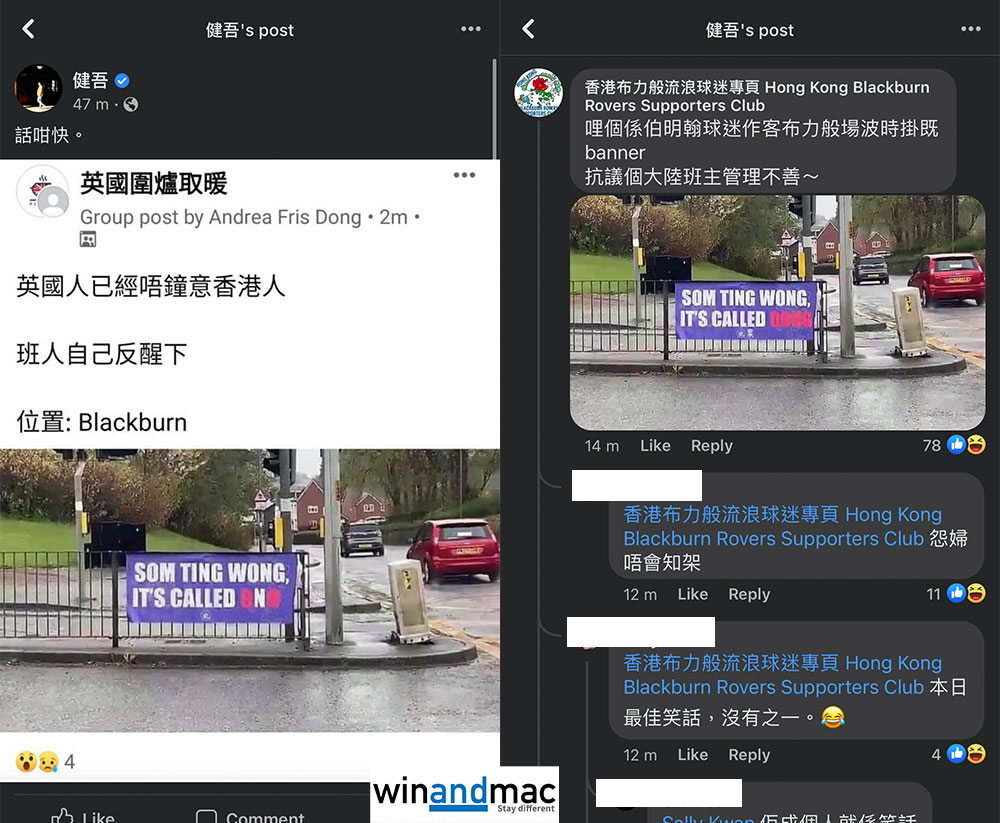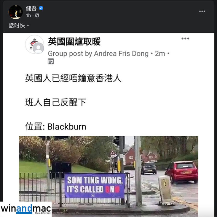較早前,香港KOL健吾突然轉發一張相片(上圖),發表文章的人稱「英國人已經唔鐘意香港人」,「班人自己反醒下」,再加上地址在英國Blackburn。有關相片上有一張橫額,寫著Som Ting Wong It’s Called BNO。這似乎想暗示香港人英文發音不準確,以及不滿持BNO Visa居留的香港人。