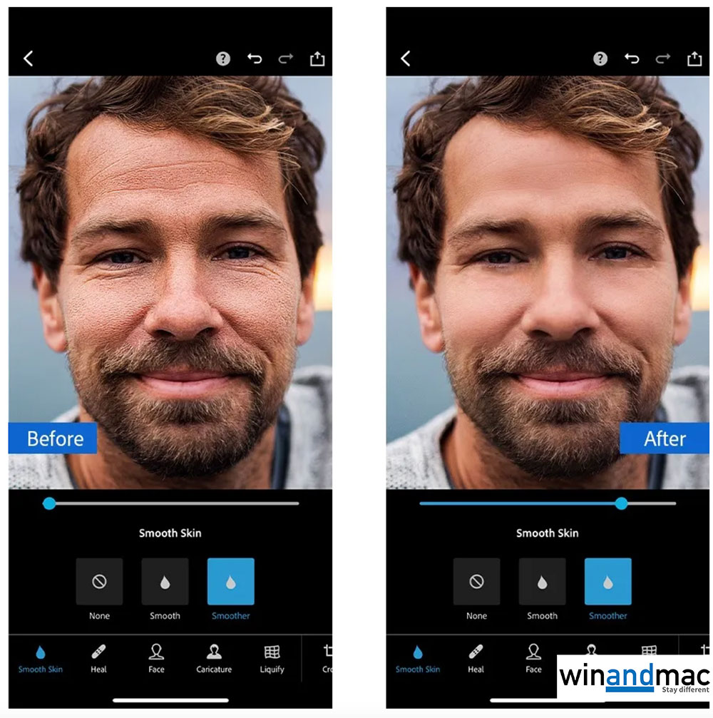 至於Photoshop Express亦加入更多自動修飾功能,當中人工智能Sensei可以偵測人部臉孔,把皮膚平滑化,又或適度改變人像的臉部特徵或形狀,例如旋轉頭部及調整角度、修改輪廓、調整笑容、重塑特徵等。甚至乎用家還可誇大眼睛、鼻子、前額等臉部特徵。