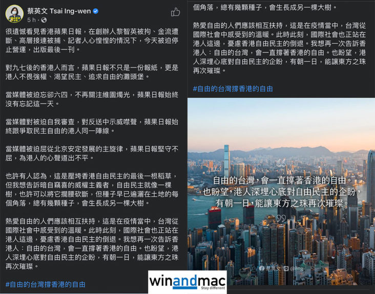 蘋果日報出事後,不少國家重要政治人物都有談論中國針對民主報章的行動。台灣總統蔡英文也有撰寫長篇文章,談及有關事情。她提到,蘋果日報不只是一份報紙,更是港人不畏強權、渴望民主、追求自由的灘頭堡。她提到傳媒被逼忘記六四、自我審查、禁提示威、要依照北京的方向時,蘋果日報堅守不屈為港人的心聲道出不平。