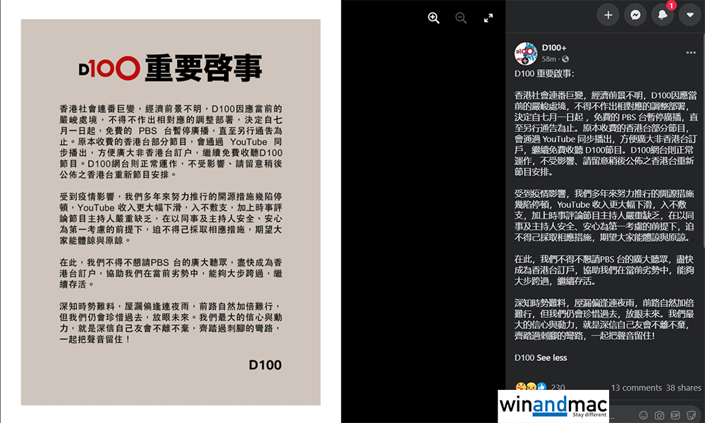 D100今日宣佈,自七月一日起,免費的PBS台暫停廣播,直至另行通告為止。原本收費的香港台部分節目,會通過YouTube同步播出,方便廣大非香港台訂戶,繼續免費收聽 D100節目。D100網台則正常運作,不受影響。PBS台有不少Phone-in節目和政治節目,但會否同時受影響,D100表示請留意稍後公佈之香港台重新節目安排。不過,D100提到除了面對經濟收入問題外,時事評論節目主持人嚴重缺乏。D100表示,以同事及主持人安全、安心為第一考慮的前提下,迫不得己採取相應措施,期望大家能體諒與原諒。