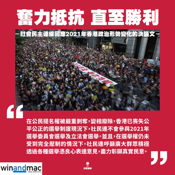 自中共政府正式通過香港完善選舉制度方案後,民主黨不同的經典人物,都對於黨員是否要參選今年立法會選舉,有不同的意見。社會民主連線(社民連)數小時前就發表文章,率先表明不會參與2021年選舉委員會選舉及立法會選舉。社民連表示,現在公民提名權被嚴重剝奪,變相廢除,香港已喪失公平公正的選舉制度現況。
