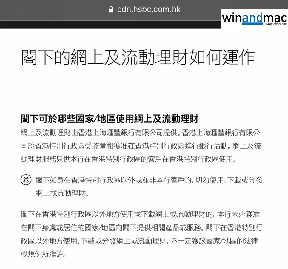 滙豐寫明,在香港以外使用或上載網上或流動理財,銀行未必獲准在閣下身處台居住的國家或地區,提供相關產品或服務。又警告客戶若在香港以外地方使用,法律上或規例上未必獲該國家或地區允許。