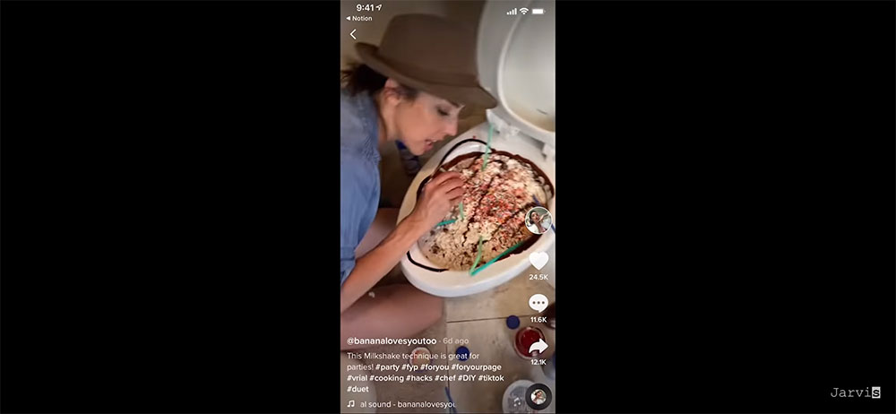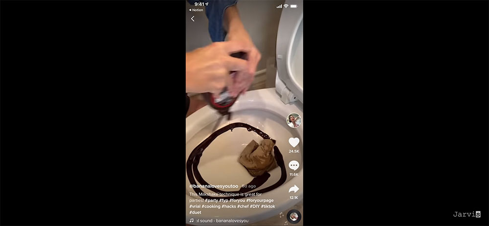 Jarvis發現,抖音中還有另一款Toilet Bowl Hack系列影片。他發現有人用真馬桶製作Milk Shake,影片中把朱古力、忌廉、朱古力碎碎等都倒入廁所。最恐怖的是,該名人士竟然沖廁,並在真馬桶上放上飲筒,竟然開始享受這款製成品。