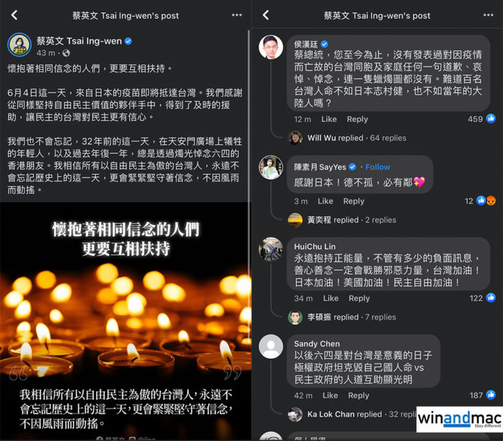 上年開始,香港無法合法地悼念64,今年亦因為防疫理由被警方禁止。今年有台灣人權組織開始舉行類似的悼念活動,就連總統蔡英文也特別發表文章,提到台灣不會忘記,32年前的這一天,在天安門廣場上犧牲的年輕人,以及過去年復一年,總是透過燭光悼念六四的香港朋友。蔡英文相信所有以自由民主為傲的台灣人,永遠不會忘記歷史上的這一天,更會緊緊堅守著信念,不因風雨而動搖。
