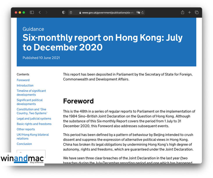 英國政府於日前發表香港問題半年報告Six-monthly report on Hong Kong: July to December 2020,提到香港於2020年下半年,在國安法推出後的情況。報告批評,國安法實施後,並沒有像北京當局原先所講只針對一小撮人,實際上是打壓言論自由。報告更提出國安法條款模糊,有潛在長期監禁,又或轉移到大陸審訊和判刑的威脅。